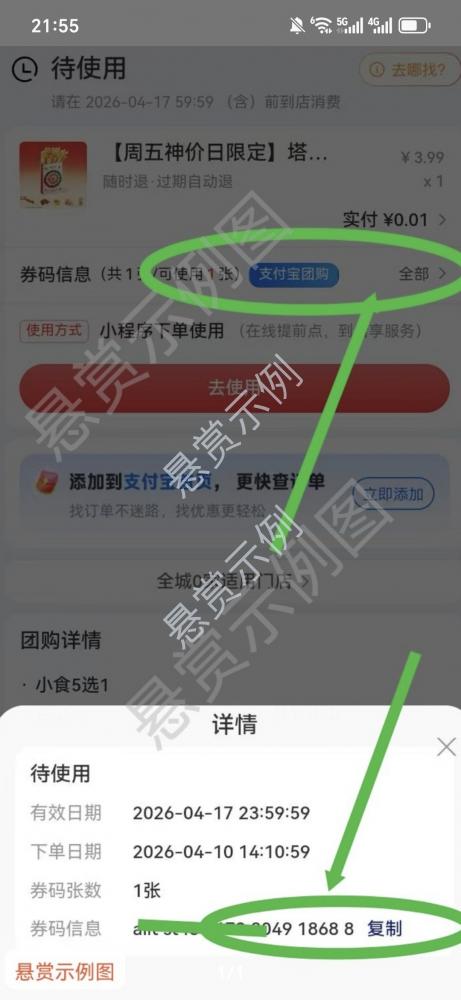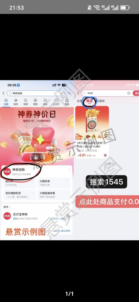 支付宝搜索:神券团购,搜索🔍 1545 ,点商品,找到薯条,显示0.01购买,支付一分钱。看图文介绍很详细